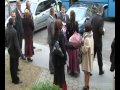 Vítanie svadobčanov za doprovodu akordeónu, resp. gitary. Nasleduje krátky príhovor, rozbíjanie taniera a zametanie črepov + prípitok, kde v jednom poháriku je pálenka a v druhom voda (zistenie, kto sa stane hlavou rodiny). Potom ženích prenesenie nevestu cez prah za zvučných fanfár.